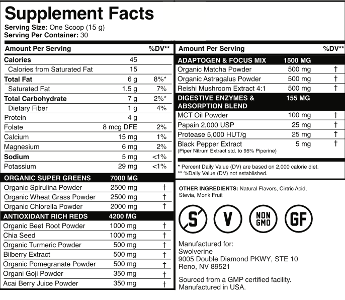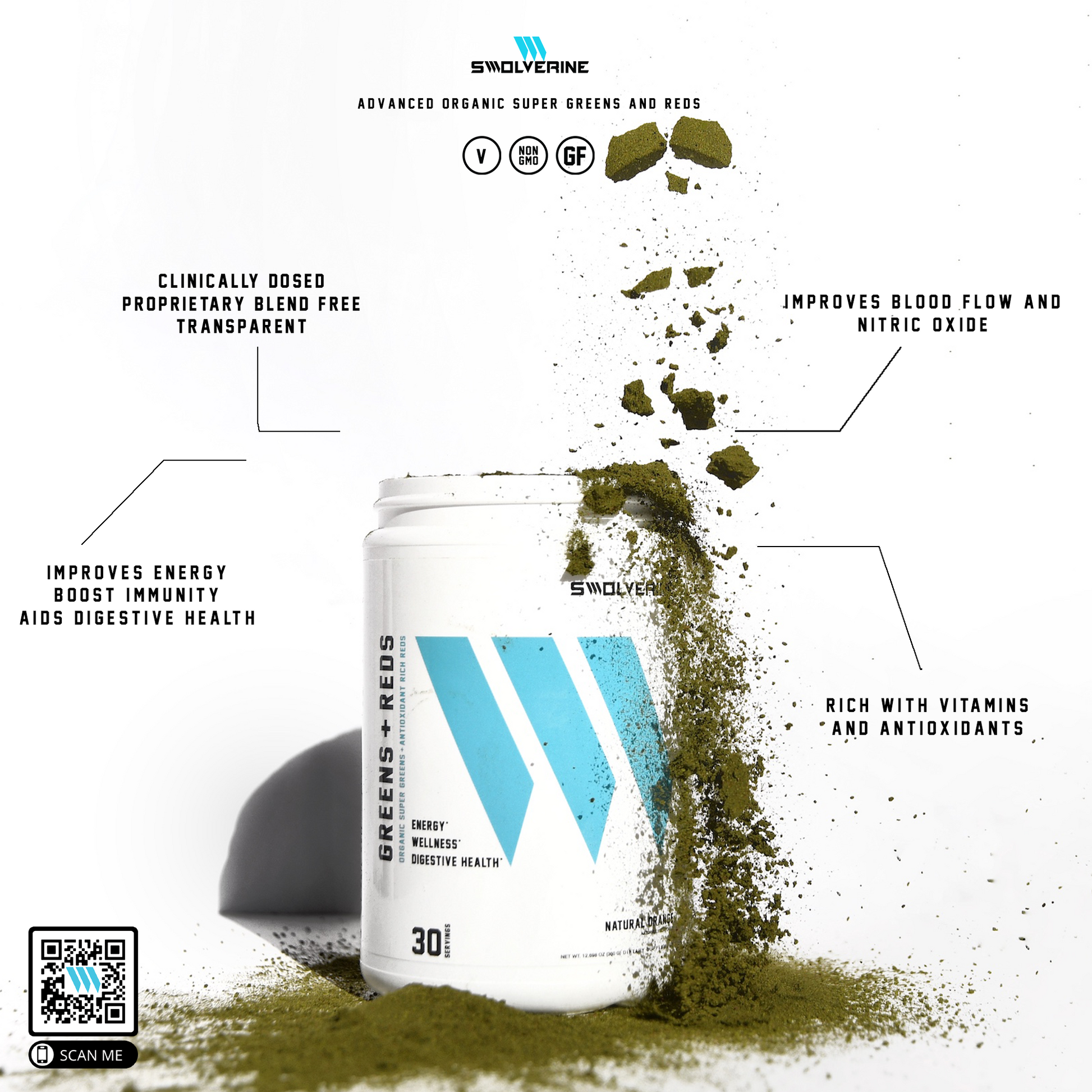 Swolverine’s Greens + Reds is a premium superfood blend packed with nutrient-dense organic greens, antioxidant-rich reds, digestive enzymes, and probiotics to support gut health, immune function, and overall wellness. Designed for athletes and active individuals, this fully transparent, clinically dosed formula ensures you’re getting the highest quality ingredients—without any artificial fillers, proprietary blends, or unnecessary additives.