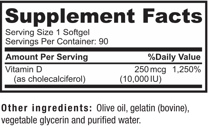 | Vitamin D3 (as Cholecalciferol) | 10,000 IU (1,250% DV) |
