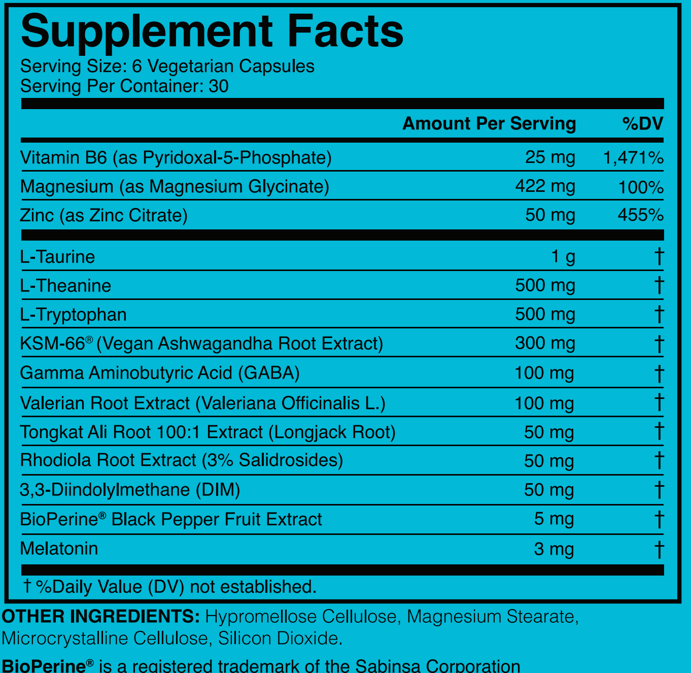 *L-theanine, GABA, valerian, tryptophan, and melatonin support relaxation, sleep onset, and overall sleep quality.